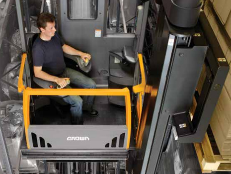Crown-科朗 TSP特窄巷道人上型三向叉车,主要用于在物流中心或配送中心的仓库内完成货物的存取作业。其特点是货叉可以向前、向左、向右三项旋转,通常在高层货架区的窄通道内进行货物的存取作业。叉车所需的作业空间小,使得仓库的空间能够很好利用,大大提高了存储面积的利用率。